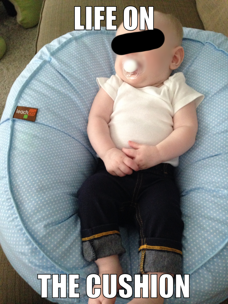 I use this thing EVERY. DAY.   When Punkie outgrows this cushion, I will be very sad .  The day is near – he is rolling now, so the cushion on the couch is no longer a totally safe hang-out for Punkie.