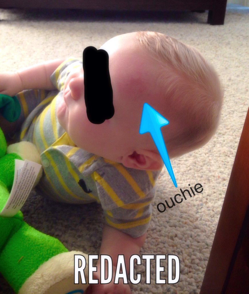 redacted ouchiePunkie is going to need a helmet.  Now that he’s crawling and pulling himself up on tables and whatever else is nearby, he is banging his head continuously.  He’s top-heavy too, so it seems like a foregone conclusion that he’ll careen around the house head-first for a while.